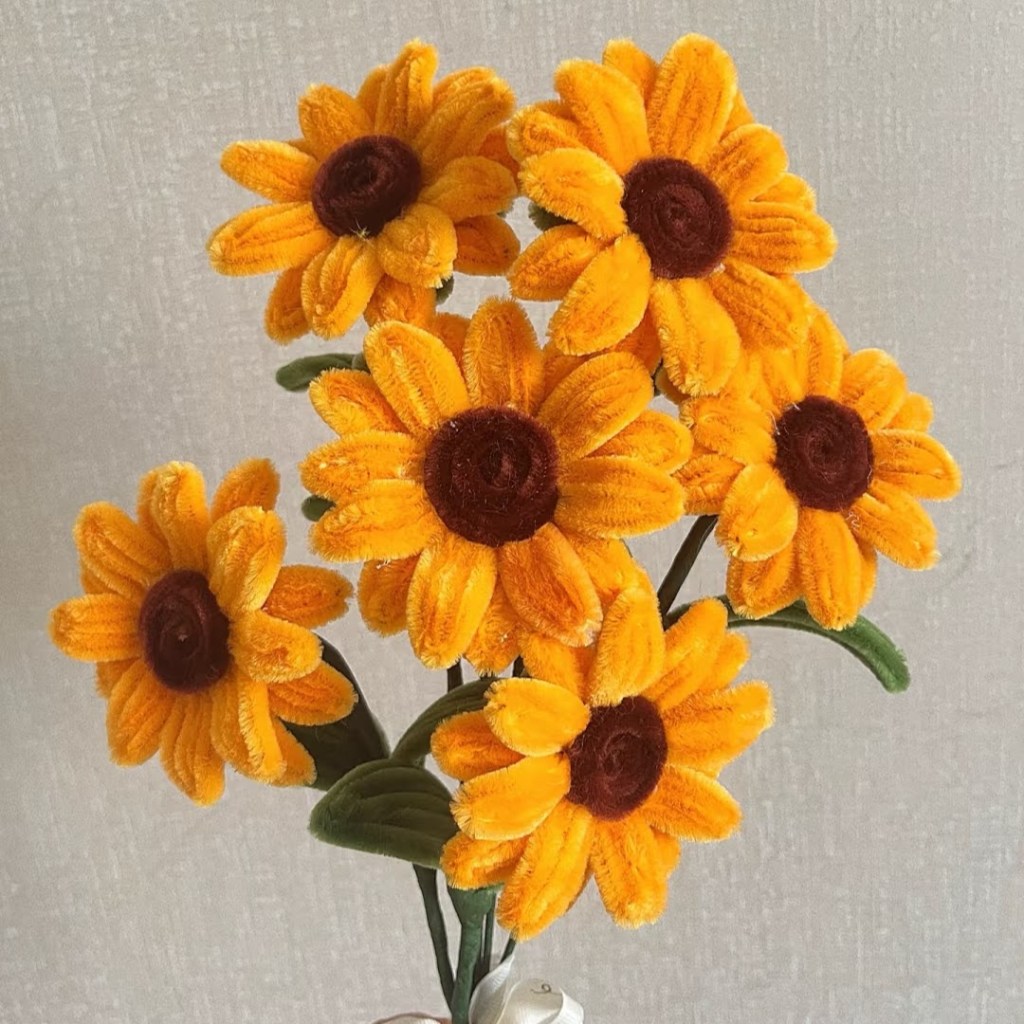 Even on cloudy days, sunflowers have a way of bringing light into the room. This little bouquet is handmade with soft fuzzy stems, each petal shaped carefully to capture the warmth and brightness of real sunflowers.
