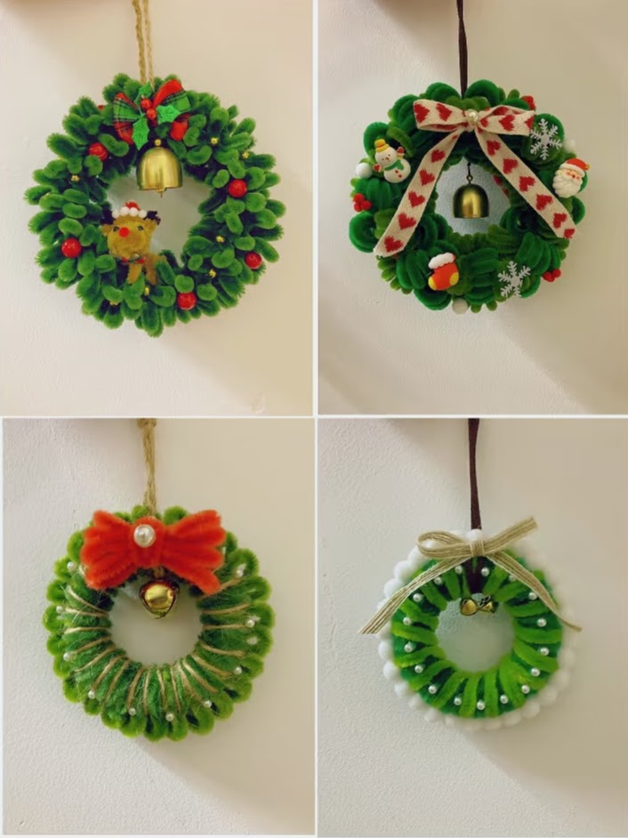 These little wreaths are handmade with soft fuzzy stems, bright ribbons, bells, and tiny festive decorations. Some have cheerful Santas, some have reindeer, and others sparkle with stars and snowflakes.