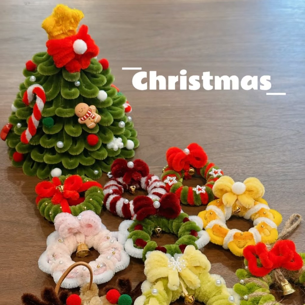 These mini wreaths are handmade with soft fuzzy chenille stems, finished with bows, bells, pearls, and tiny festive accents. Each one is colorful, cheerful, and just the right size to hang on a tree, a doorknob, or even use as a gift topper.